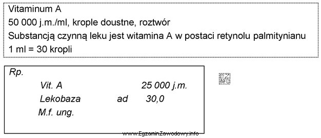 Oblicz, korzystając z informacji o preparacie Vitaminum A, liczbę kropli roztworu witaminy A, której należy użyć do sporządzenia leku według recepty.