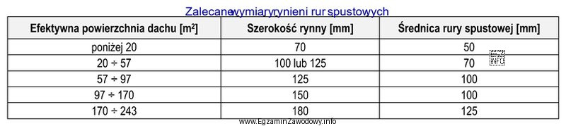 Na podstawie danych zamieszczonych w tabeli, określ wymiary rynny oraz rury spustowej, które należy przyjąć do odwodnienia dachu jednospadowego o powierzchni efektywnej 162 m