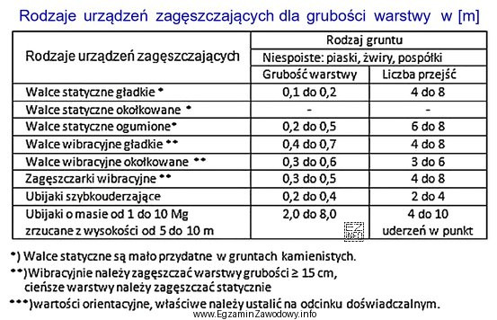 Na podstawie danych zawartych w tabeli określ, jaką liczbę przejść walca statycznego gładkiego należy przyjąć przy zagęszczaniu pospółki o grubości warstwy równej 0,15 m.