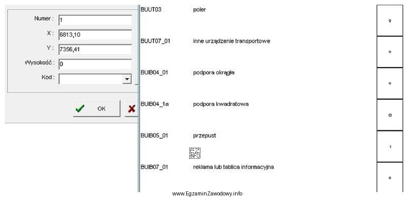 Na podstawie danych zamieszczonych w oknach dialogowych z programu kartograficznego ustal, który kod obiektu należy wybrać, aby w miejscu punktu nr 1 na mapie wstawić symbol podpory okrągłej.