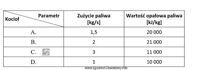 Tabela przedstawia parametry kotłów. Który z kotłów ma największą moc cieplną?