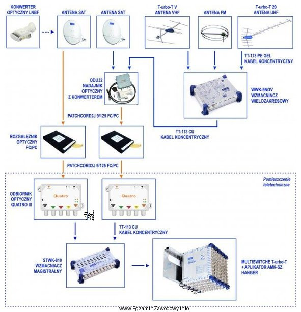 Schemat przedstawia instalację dystrybucyjną sygnału TV do rozproszonych budynków w oparciu o jedno pole antenowe. Który rodzaj kabli połączeniowych został oznaczony na schemacie kolorem pomarańczowym?