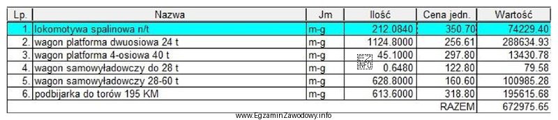 Korzystając z tabeli, wskaż pojazd kolejowy o najniższej cenie jednostkowej maszynogodziny.