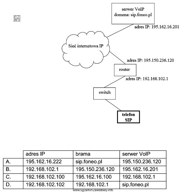 Na podstawie przedstawionego schematu sieci wskaż jakie wartości parametrów powinien posiadać telefon SIP?