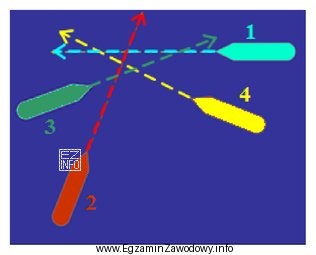 Zgodnie z zasadami prawa drogi jednostki tej samej kategorii, które znalazły się w przedstawionej na rysunku sytuacji na akwenie o nieustalonym kierunku ruchu powinny przejść w kolejności