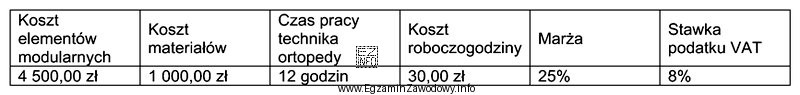 Na podstawie danych zawartych w tabeli oblicz cenę brutto wyprodukowania protezy modularnej podudzia.