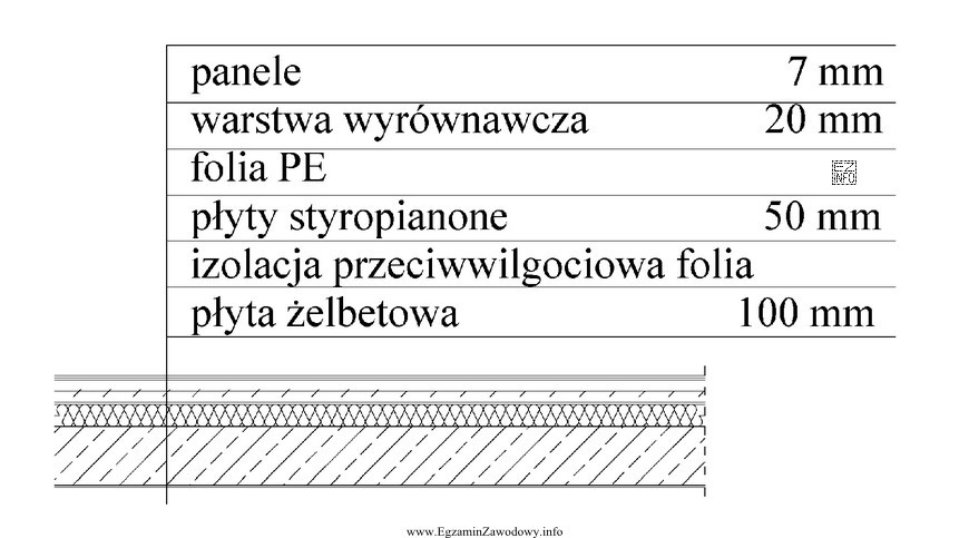 Na podstawie rysunku przedstawiającego warstwy posadzki wskaż grubość warstwy izolacji termicznej