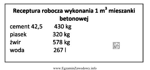 Na podstawie przedstawionej receptury roboczej oblicz ilość piasku potrzebną do wykonania 1,5 mieszanki betonowej.