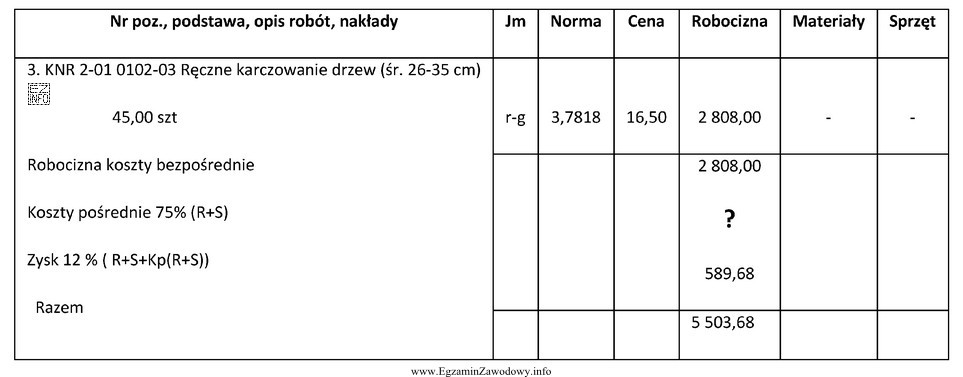 Którą wartość kosztów pośrednich należy wpisać w miejsce znaku zapytania w przedstawionym fragmencie kosztorysu powykonawczego?