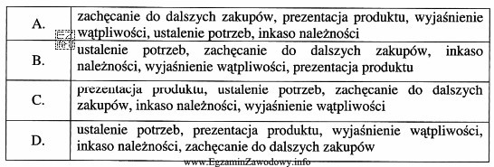 Do sklepu z zabawkami z tradycyjną metodą sprzedaży wszedł klient z zamiarem zakupu prezentu dla dwuletniego dziecka. Prawidłowy przebieg jego obsługi opisany został w tabeli w wierszu