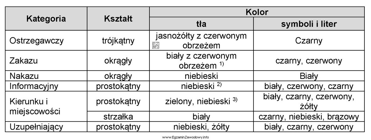 Korzystając z tabeli określ kształt oraz kolor symboli i liter znaków nakazu.