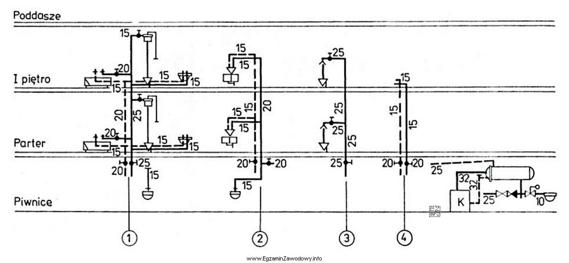 Na przedstawionym rozwinięciu instalacji wody zimnej i ciepłej, odgałęzienie wody zimnej do wanny na pierwszym piętrze ma średnicę