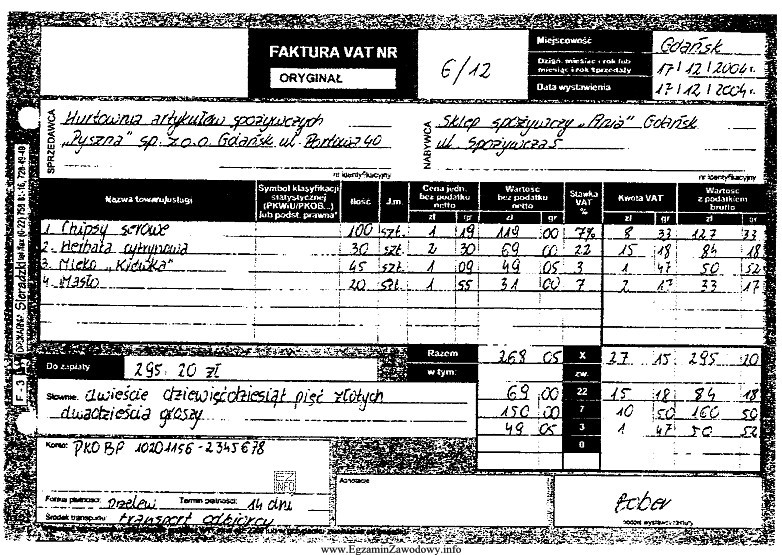 Na podstawie zamieszczonej faktury VAT, określ kwotę podatku VAT naliczonego dla sklepu spożywczego "Ania".
